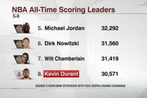 KD生涯总得分30571 若按上季场均数据65场可超乔丹&挤进历史前5!
